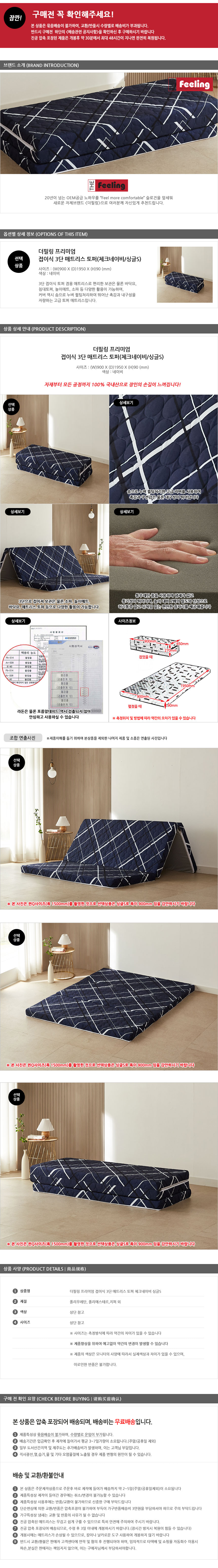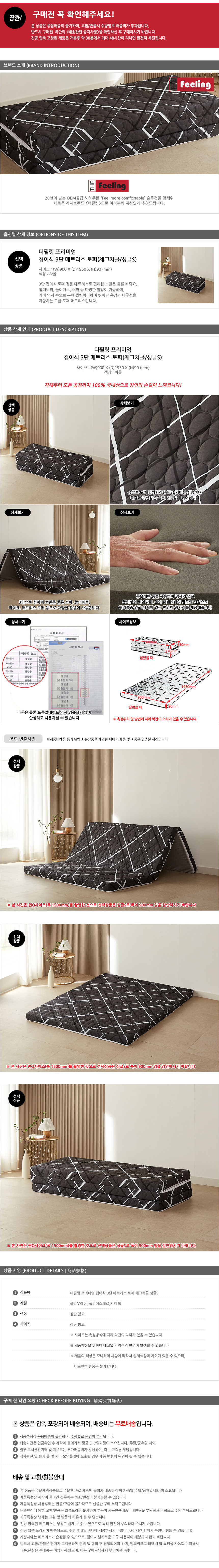 더필링 프리미엄 접이식 3단 매트리스 토퍼 체크 싱글S_색상 택1