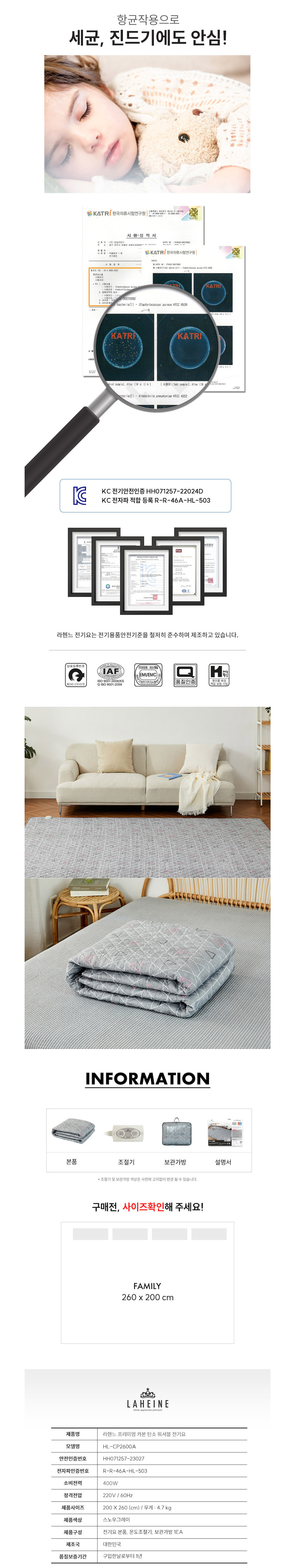 [라헨느] 스노우그레이 탄소열선 카본매트 워셔블 전기요 패밀리(특대형)